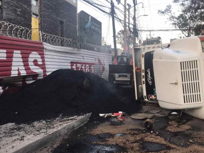 Servicios de emergencia acudieron esta mañana a la volcadura de un camión que transportaba 15 toneladas de grava negra para asfalto en el cruce de Rómulo O’Farril y la calle de Don Manuelito en la colonia Olivar de los Padres en la alcaldía de Álvaro Obregón.
