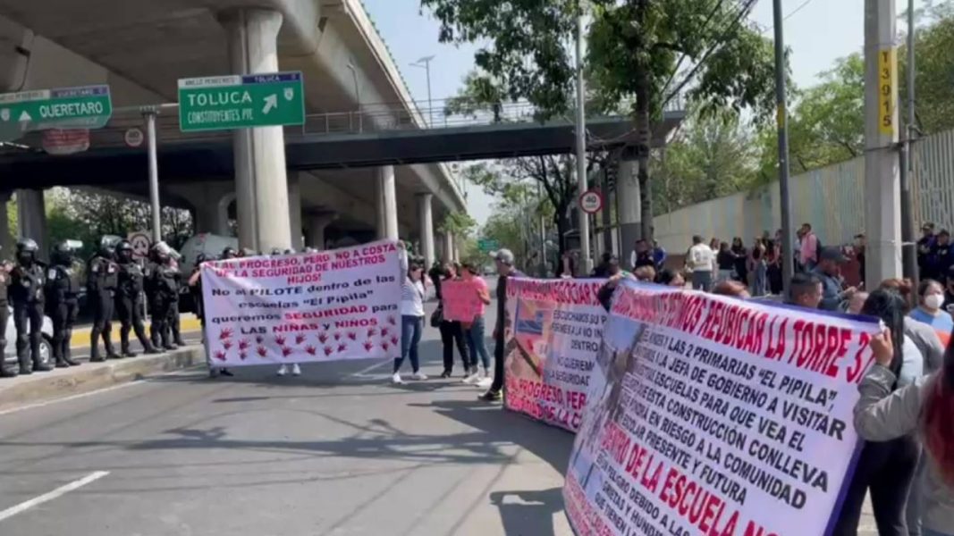 Padres de familia de alumnos de la Escuela Preescolar “El Pípila” realizan un bloqueo en Periférico y Constituyentes, debido a que están en contra de que se instale una columna para el proyecto del Cablebús que conectará el Bosque de Chapultepec con Santa Fe, así como con el Tren Interurbano.