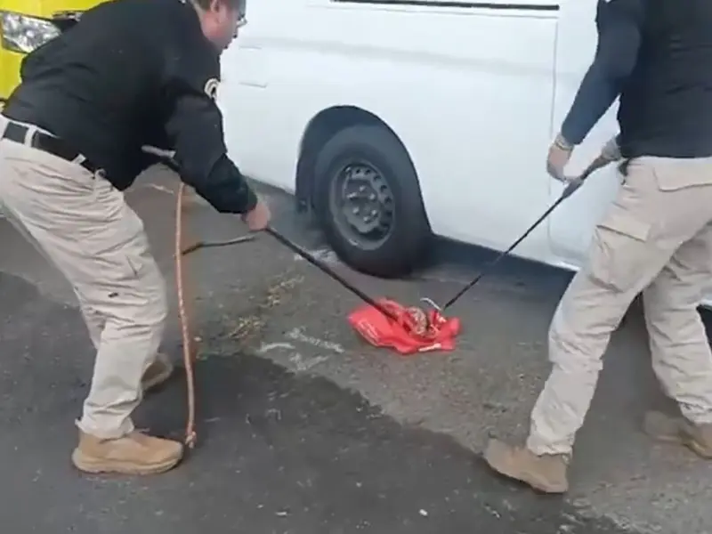Con todos los cuidados correspondientes y las maniobras de contención, en coordinación con personal de la Reserva Ecológica de la Universidad Nacional Autónoma de México (UNAM) y una Fundación, con una pinza herpetológico y un recipiente, colocaron a la víbora para luego ser trasladada a sus instalaciones donde será valorada y posteriormente liberada en su hábitat.