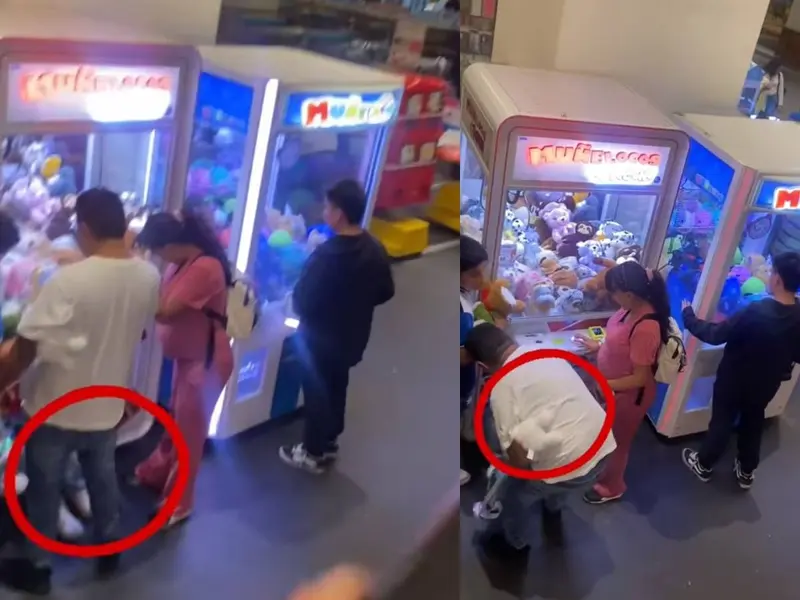 En el video, se observa a un hombre y una mujer embarazada ayudando a una niña pequeña a introducirse por el orificio de la máquina, por donde normalmente caen los premios. La menor, debido a su tamaño, logra entrar con facilidad mientras los padres la guían para que saque los peluches sin necesidad de jugar. Junto a ellos también se encontraba un niño de aproximadamente 12 años, presuntamente el hermano de la niña.